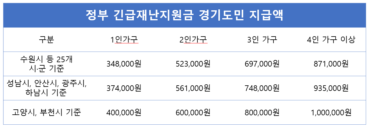 경기도민을 대상으로 정부 긴급재난지원금 지급액을